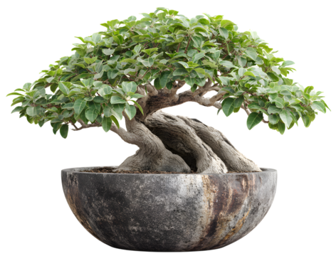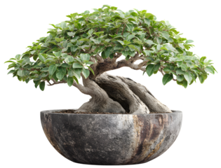 Fresh green bonsai tree in a white pot isolated on a transparent background with herbal sage and rosemary ingredients for natural medicine and healthy cooking