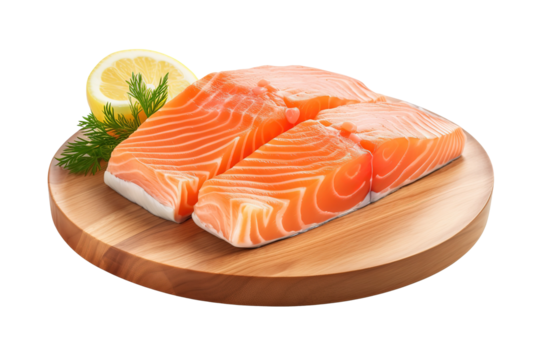 slice of raw salmon on wooden board isolated white or transparent background