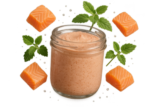 Salmon pate in glass jar with fresh salmon and mint on transparent background