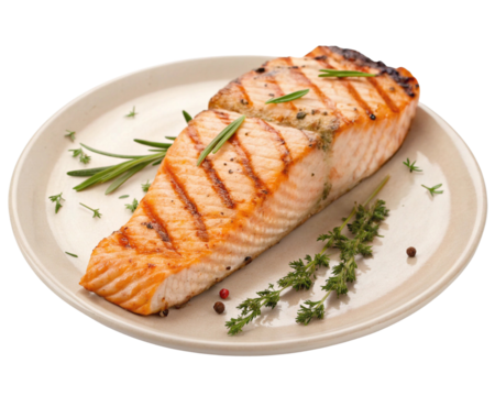 Top view photo of a fillet or piece of raw salmon meat with pepper or spices prepared for cooking isolated and generated with AI in png file format