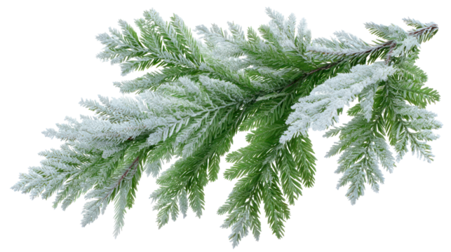 Snowy Green Fir Branch Laying Diagonally with Fresh Snowfall Highlights on transparent background
