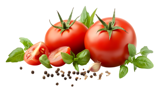 Top view of fresh tomatoes and basil leaves isolated on white or transparent background