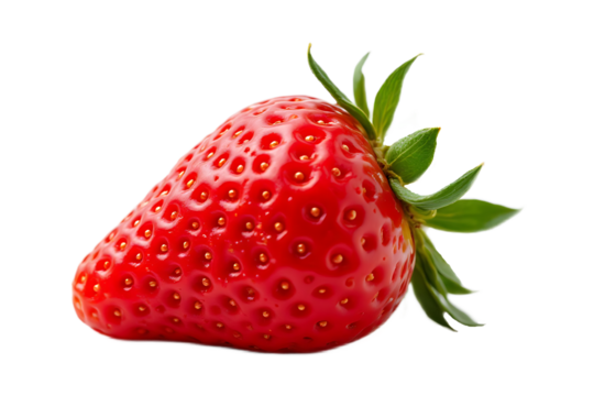 A red strawberry with a green leaf on top. The strawberry is ripe and ready to eat. The image has a fresh and healthy vibe