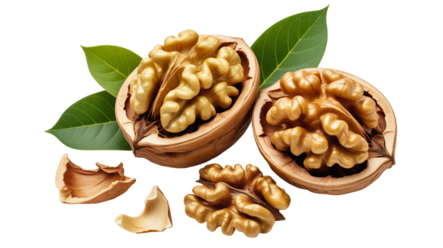 Group of fresh walnuts with one cracked open isolated on transparent background