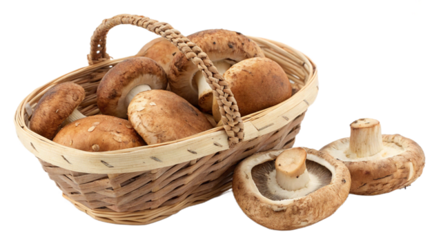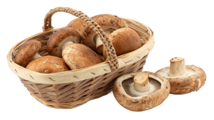 Woman holding basket of fresh fruits and vegetables on transparent background