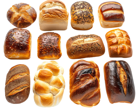 Assortment of freshly baked bread loaves in various shapes and sizes. Isolated on transparent background.