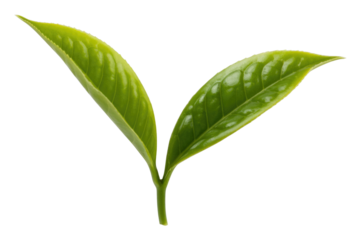 Two vibrant green tea leaves, freshly picked and isolated on a transparent background. background removed