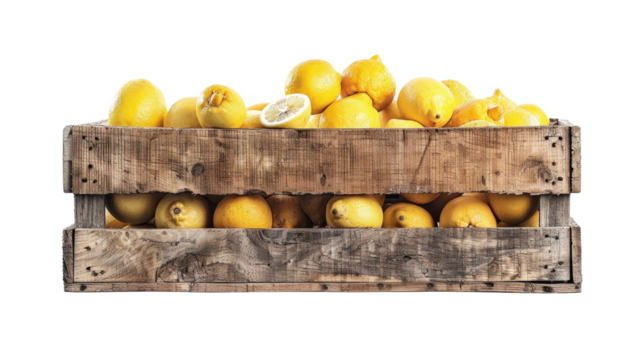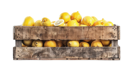 Wooden crate overflowing with freshly picked lemons on transparent background