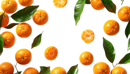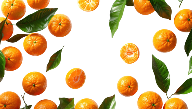Freshly picked vibrant orange citrus fruits, along with some cut halves, and lush green leaves are arranged on a contrasting black background to create a cheerful and natural composition.