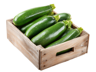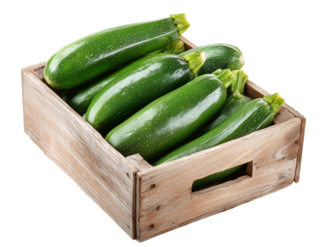 Fresh zucchini, freshly picked zucchini are arranged in a rustic wooden crate, exuding a natural feel of harvest.