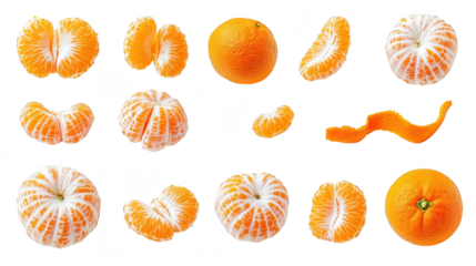 A collection of freshly peeled and segmented oranges and mandarins arranged artistically on a white background. their juicy texture and bright color. ideal for food photography