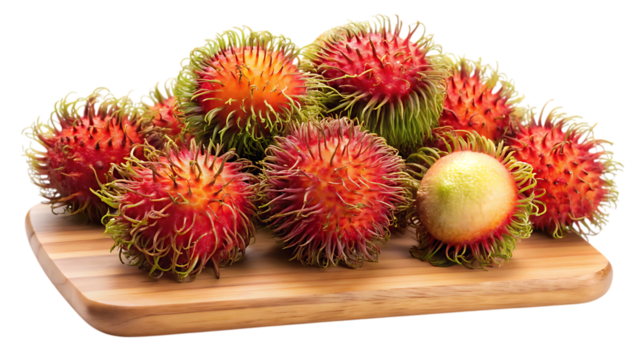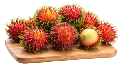 Vibrant red rambutan fruits, freshly picked and arranged on a light brown wooden cutting board