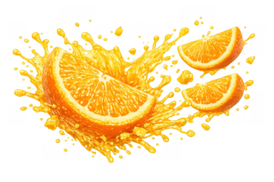Orange slices bursting with juice creating a vibrant splash, showing freshness and natural citrus flavor on transparent background