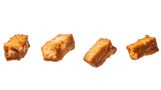 Multiple fried tofu triangles falling on transparent background