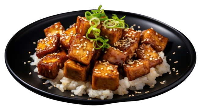 plate of rice and fried tofu with sesame seeds isolated on transparent background, top view