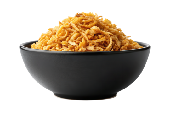 Green bean casserole topped with crispy fried onions, a classic thanksgiving side dish, presented in a white bowl with a transparent background
