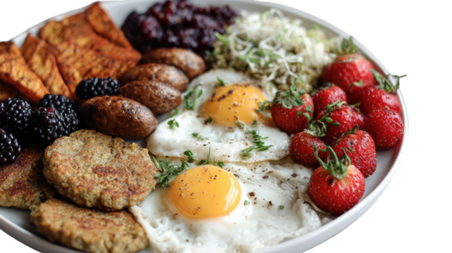 healthy brakfast plate with fried eggs sausages berries vegetables balanced protein meal close up on white background