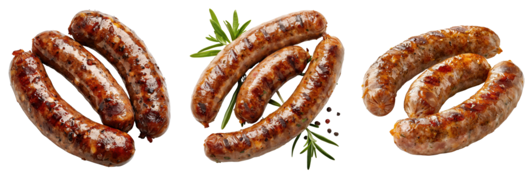 set of beef sausage links with a crispy exterior on a transparent background