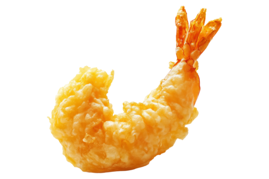 Deep fried shrimp tempura in golden batter, isolated on white transparent background, concept of Japanese cuisine delicacy