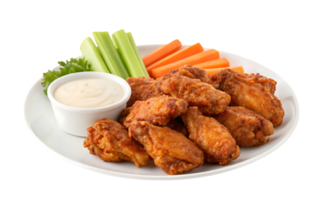 Delicious fried chicken wings with ranch dip and vegetables on transparent background