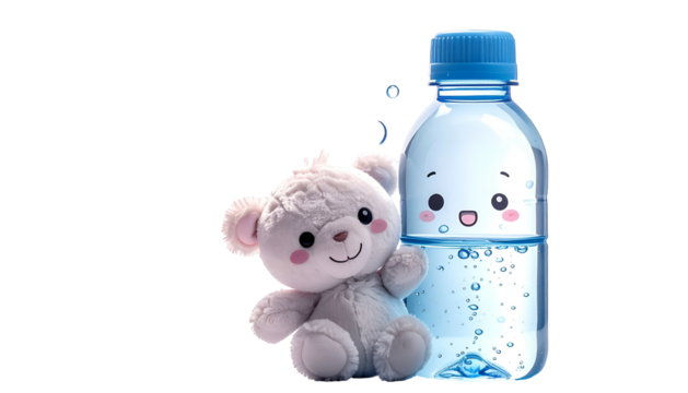 Adorable stuffed bear hugging a water bottle with a cute face. Clear background