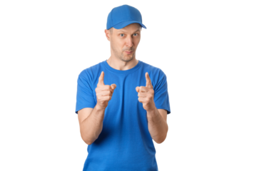 Young man in blue shirt making call me hand gesture transparent background