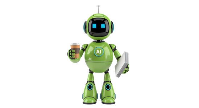 Green AI Robot Holding Coffee Cup and Notebook artificial intelligence
