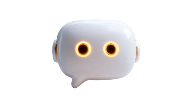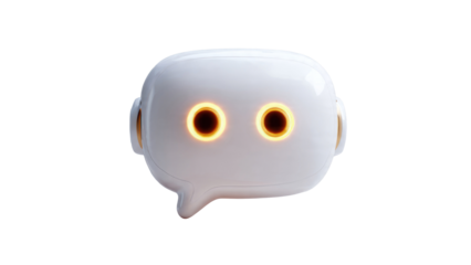 A cheerful robot head sits on a round base within a blue speech bubble