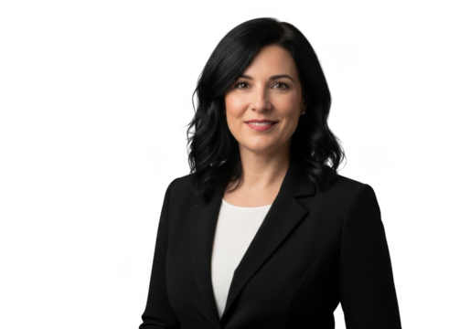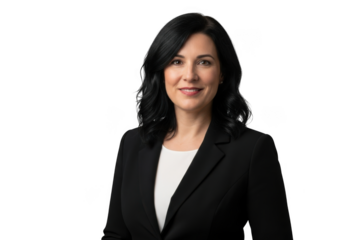 Professional businesswoman with dark hair wearing a black blazer and white shirt isolated on transparent background