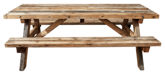 A detailed, front-facing view of a rustic, wooden outdoor picnic table, isolated on black background