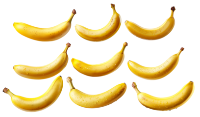 Set of yellow bananas with water droplets, isolated on white background