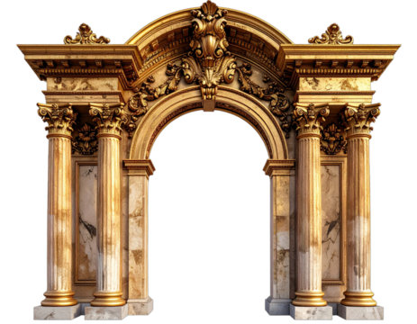 Ornate gold-toned archway with detailed carvings, columns, and a marble base