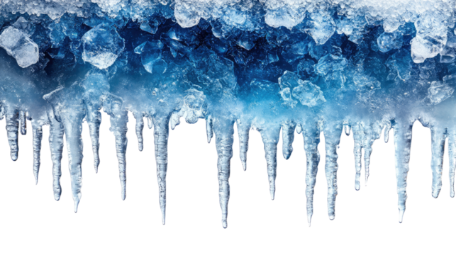 Frozen blue icicles hanging in a horizontal row, winter season ice formation on a transparent background, PNG image