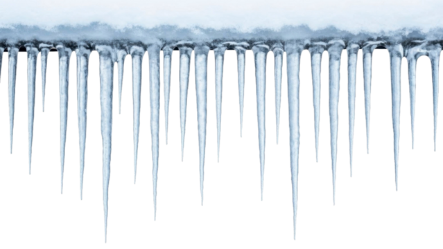 Icicles and white snow hanging, creating a frosty winter scene with natural elements, transparent background