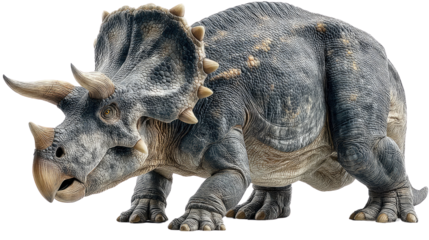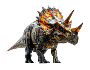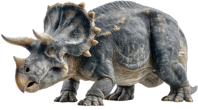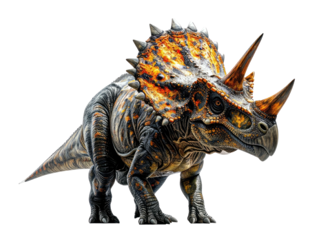 Photorealistic rendering of a massive prehistoric triceratops dinosaur with detailed organic skin texture, intricate horns and frill, striking color contrast cinematic lighting, png file isolated on t