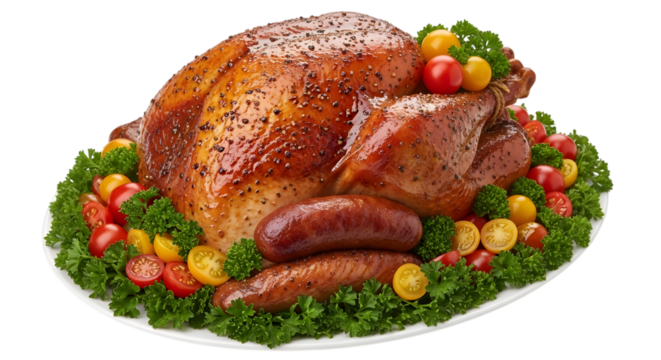 A beautifully roasted turkey with sausages and cherry tomatoes, isolated on transparent background
