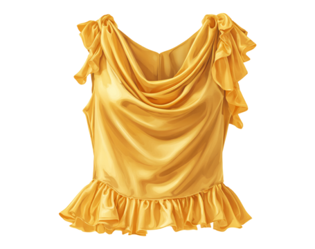 Elegant golden silk blouse with ruffles and bow details isolated on a transparent background