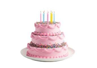 Pink birthday cake, ruffled borders, rainbow sprinkles, lit candles, white plate, clean background, studio lighting, bokeh. Birthday celebration atmosphere