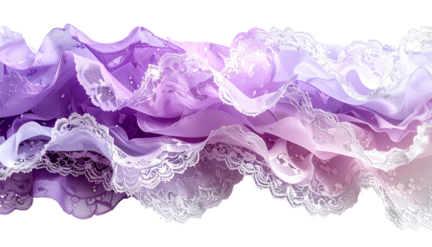 Flowing, layered fabric in shades of lavender and white, adorned with delicate lace