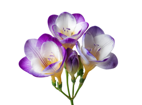 Close-up of three fritillary flowers, vibrant purple and white petals,  soft yellow centers