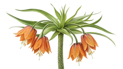 Close-up illustration of a fritillary plant featuring hanging, reddish-purple bell-shaped flowers