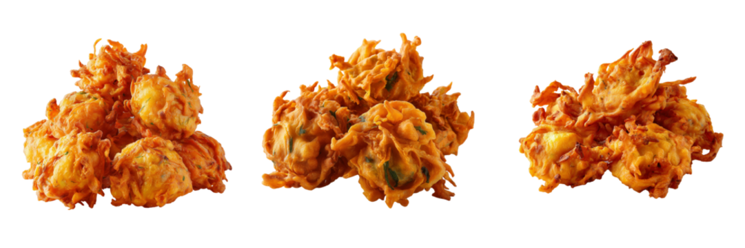 Three piles of golden brown crispy fried onion fritters pakora isolated on a transparent background image