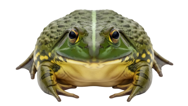 A majestic, life-like American Bullfrog, Lithobates catesbeianus, sitting attentively. Isolated on Transparent and White Background
