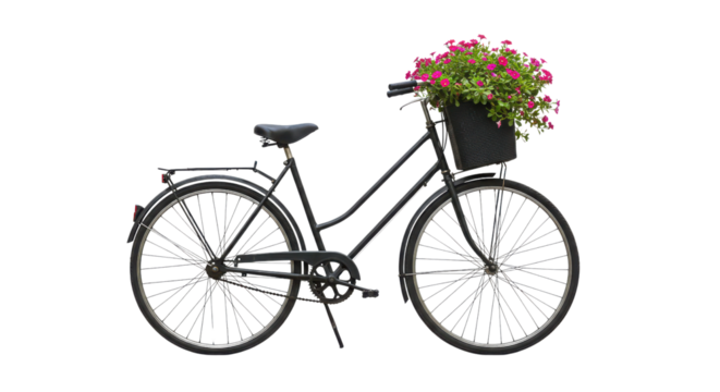 Black vintage bicycle with front basket of pink flowers isolated on white