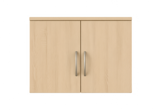 Closed wooden hanging kitchen cabinet with metal handles on transparent background