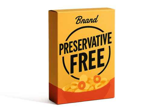 Bright cereal box with bold preservative free label isolated on transparent background, preservative free