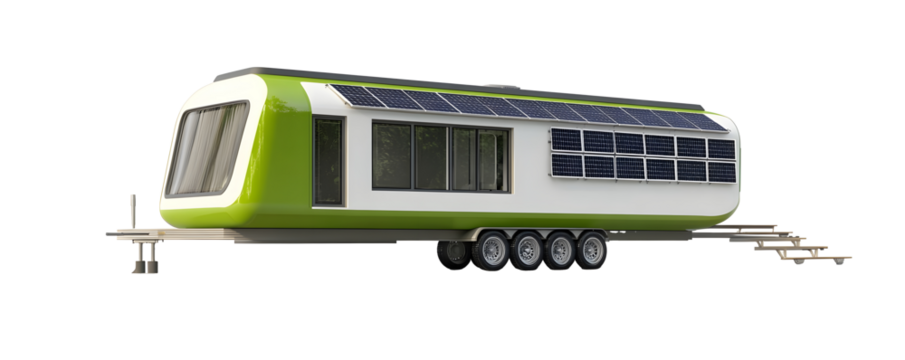rendering 3D of modern green and white trailer house with solar panel technology isolated on white background