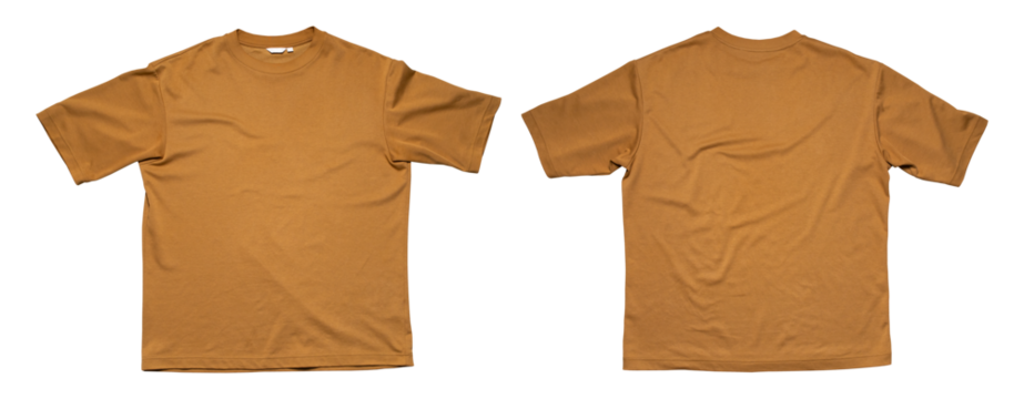 Blank tan t-shirt mockup for apparel design, showing front and back views. Isolated on transparent background, png
