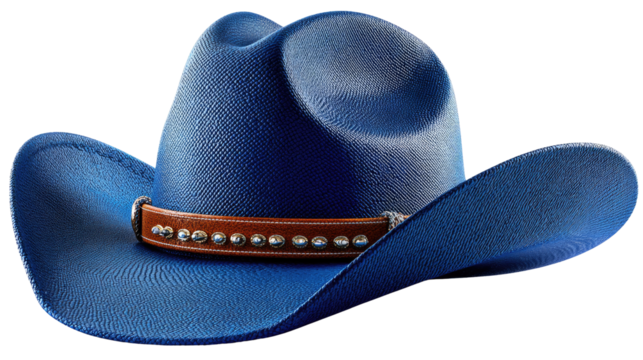 Western Chic: A detailed shot of a blue cowboy hat, a symbol of adventure, the American West, and the allure of the open road, with a close-up on the leather band and its metallic studs.