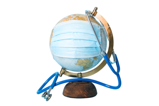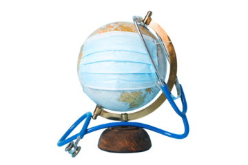 Masked globe with stethoscope symbolizes healthcare, isolated on white